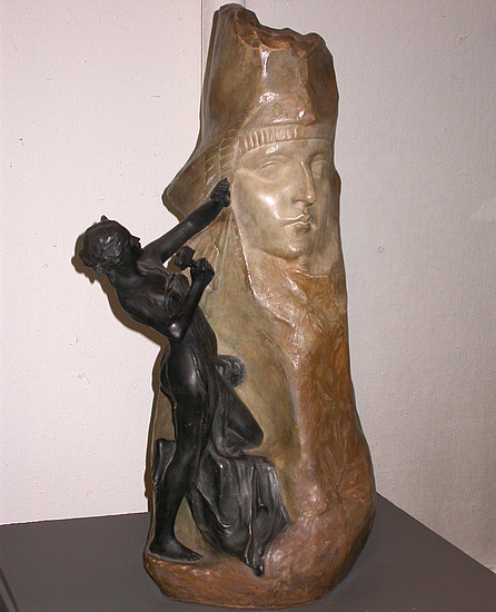 This 1905 vase by Goldscheider Keramik (Austria) in the Everson Museum (Syracuse, NY) is labled "Sculptor(ess) with sphinx." |